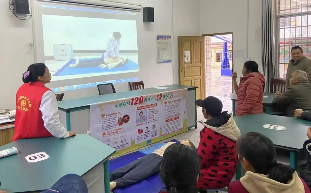在新城小学一楼教室,100余名村民经历了一场“生命必修课”。全科医生隆秀曾副院长用方言讲解讲授了常见传染病的预防、外伤应急急救、一氧化碳中毒、烫伤应急处理、心梗的快速甄别、脑梗和脑出血的先兆及初步判定等。护理部部长吴荣梅、临床科护士长韦雨杉用手持AED演示“黄金四分钟”救援流程。村民轮流在模拟人上实操。村医黄红感慨:“以前村里有人突发心脏病只能干着急,现在有了AED,我们抢救更有底气!”作为南丹县首个山村AED配置点,该设备由广西药检院组织广西正云科技有限公司捐赠,全天24小时存放于村卫生室,村委同步组建5人应急救护队。村民踊跃互动,现场发放急救健康手册200余份。