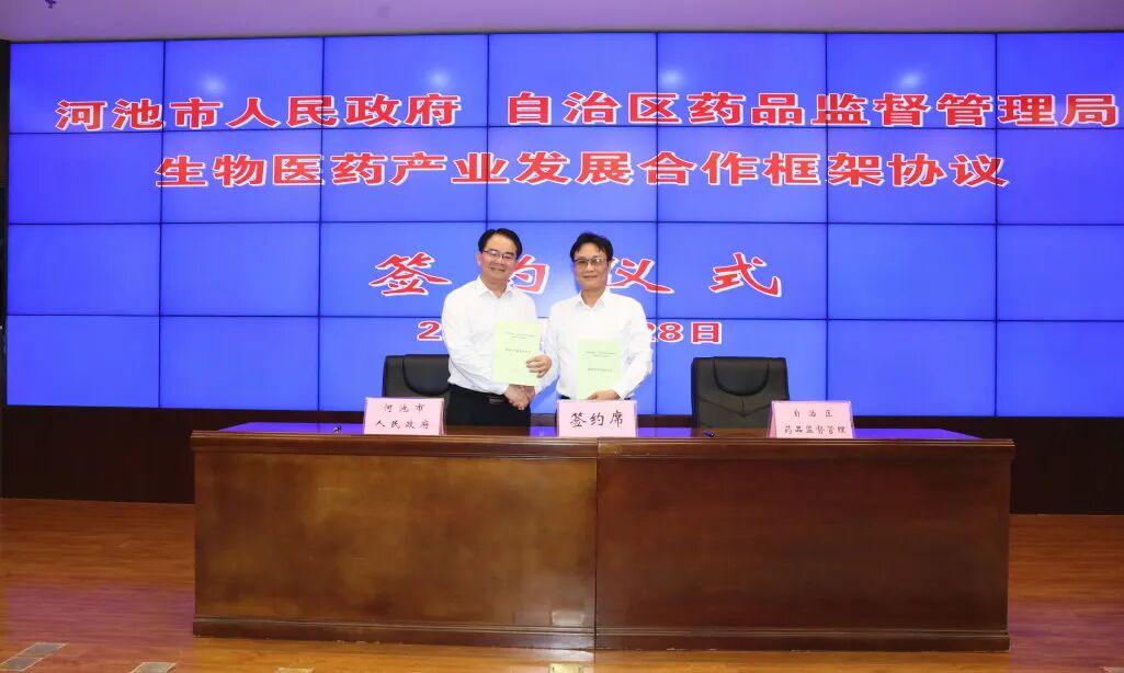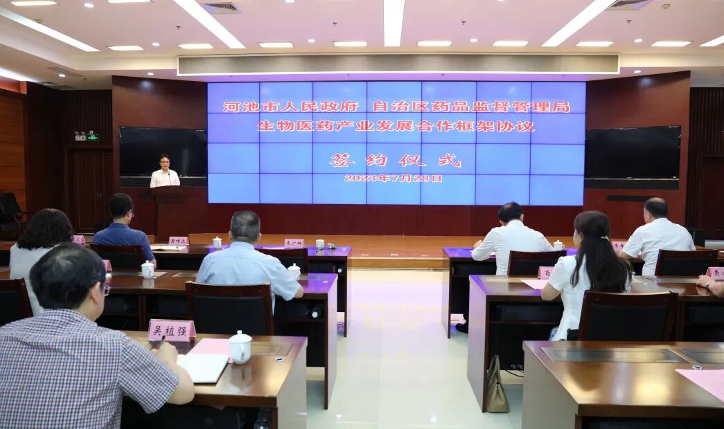 为贯彻落实自治区党委政府关于完整准确全面贯彻新发展理念推动高质量发展、建设壮美广西的共同目标,7月28日,AG真人与河池市人民政府在南宁市签订《生物医药产业高质量发展战略合作框架协议书》,共同推动以药品、医疗器械和化妆品产业为重点的河池医药产业高质量发展。AG真人党组成员、副局长韦广辉,河池市人民政府副市长陆景宇分别在签约仪式上致辞,并代表双方签约。