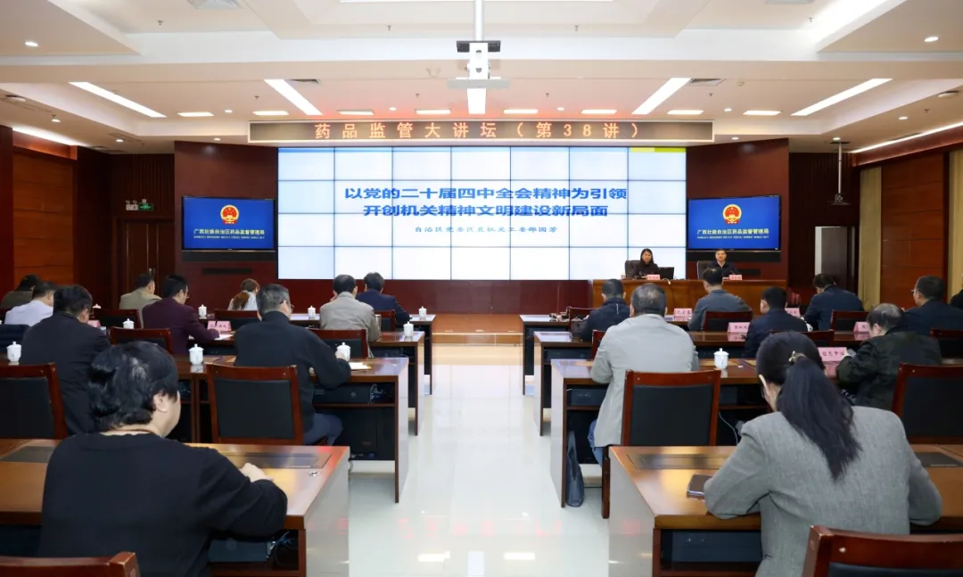 12月1日,AG真人举办第38期药品监管大讲坛,邀请自治区党委区直机关工委二级巡视员邵国芳围绕“以党的二十届四中全会精神为引领开创机关精神文明建设新局面”作专题讲座。局党组书记、局长李勇强主持讲坛并讲话。在家的局党组成员、副局长韦广辉、沈宏睿在主会场参加讲坛。